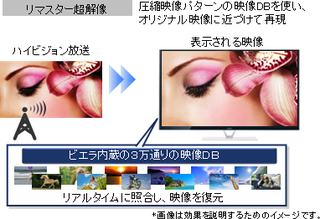 また、新たな映像処理技術「ファインリマスターエンジン」を搭載。デジタル放送の圧縮時に失われたデータを復元するため、約3万パターンの映像データベースとリアルタイムにパターンマッチングを行い、オリジナル映像のディテールに近づける。
