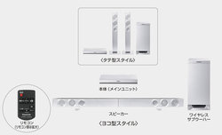 【SPEC】●スピーカー構成:<フロント部>3ウェイ3スピーカーシステム(バスレフ型)、5.7cmコーン型ウーファー×1、2.5cmセミドームトゥイーター×1、ピエゾ型スーパートゥイーター×1 <サブウーファー部>1ウェイ1スピーカーシステム(バスレフ型)、16cmコーン型ウーファー ●外形寸法:<本体>310W×45H×188Dmm <スピーカー>68W×541W×41Dmm(縦置き時) <サブウーファー>180W×408H×306Dmm ●質量:<本体>約1.15kg <スピーカー>約0.78kg(縦置き時) <サブウーファー>約4.76kg