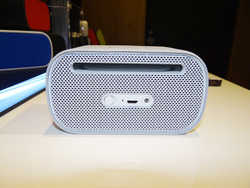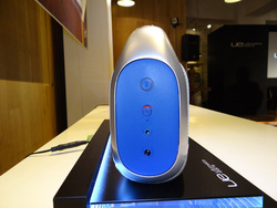 “ブームボックス”「WS800」は、「外装の質感にこだわった」(黄氏)という、ボディにアルミステンレスとゴム素材のハイブリッド素材を用いたワイヤレススピーカー。アルミ部分のカラーがシルバー、側面ゴム素材のパーツはブルーに配色されている。側面には電源やボリュームボタン、3.5mmステレオミニ入力端子などを設けた。