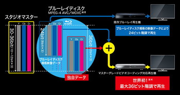 通常のBDは、Y/Cb/Crがそれぞれ8ビット(計24ビット)で記録されている。今回開発した新技術のMGVCでは、スタジオマスターと同様の各々12ビット(計36ビット)の映像をBDに記録することが可能。同社では「世界で初めてスタジオマスターと同等の36ビット高階調映像を実現した」としている。