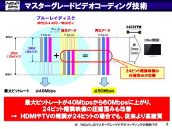 なお、MGVCで生成された各々12ビットの映像は、最大ビットレートが通常のBDの40Mbps程度から60Mbps程度に上がる。また、テレビがたとえ各々8ビット階調にしか対応しておらず、非DeepColorで伝送したとしても、入力される8ビット信号のうち下位4ビット分にサブストリームの良質なデータが使われ、歪みが少ないため、従来に比べて高画質な再生が期待されるという。