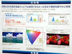 前モデル「LCD-55LSR3」で採用した赤色レーザーバックライトに加えて、LED光源に新たに青色用LED、緑色用LEDを独立して採用。LCD-55LSR3で採用したバックライト光源のシアン色LEDを、シアン色の中で青色用LEDと緑色用LEDに分離することにより、緑色系や緑と赤から作り出される黄色系の発色が鮮やかになったという。