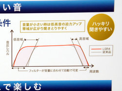 同機能については石井氏は、一般的にテレビが薄型化してスピーカー用のスペースも少なくなっているという点に言及。「音量を上げたときの弊害を防ぐためにローパスフィルターなどをかけており、つまりスピーカーの性能が完全には出ていなかった」とコメント。「そこで本機では音量が小さいときはスピーカーの特性をフルで引き出すようにした」と説明した。