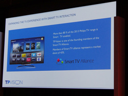 フィリップス・ブランドのテレビ製品については、2013年モデルのラインナップのうち「80%」がスマートテレビで構成される。同社は昨年6月にLG電子とともにスマートTVアライアンスを立ち上げ(関連ニュース)、スマートテレビ向けアプリの開発環境の整備にも注力してきた。現在アライアンスメンバーによるスマートテレビ商品の市場シェアは43%に上るという。