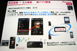 直感的な操作感に定評のあるアプリも「iControlAV2013」に進化。1台のAVアンプに対して4つのiOS/Android端末で同時接続ができるようになった。ホーム画面で各機能を選ぶ際や、別のメニューに遷移する際、フリックで選択/移動ができるようになった。これはユーザーがいつも使っているスマートフォンと似た使い勝手を目指したのだという。