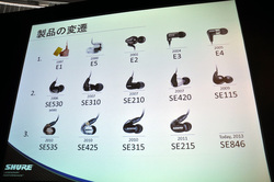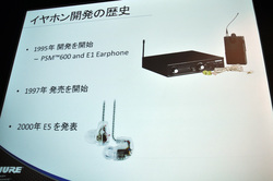 はじめにSHUREのイヤホン開発の歴史が紹介された。同社では1995年に「PSM600」と「E1」によるプロ用のインイヤー・モニターシステムを開発・発表。1997年から販売をスタートし、「コストパフォーマンスの高いシステムとして多くのユーザーから支持を集め、本機がモニターイヤホンの市場を開拓してきた」とエングストローム氏は振り返った。続いて2000年に発表されたイヤーモニター「E5」は、ユニバーサルな形状ながら多くのユーザーに優れたフィット感を提供する製品としてヒット。その成功が現在のSHUREにおけるハイエンドシリーズの開発につながっているという。