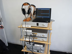 オーディオデザインは、従来のマルチビットDAC「DAC-FA0」のデジタル入力部をUSB非同期型のインターフェースに変更したUSB-DAC試作機「DCDAC-100(仮称)」を参考展示。ヘッドホンアンプ「DCHP-100」との組み合わせで試作機をさっそく体験できるようにしていた。