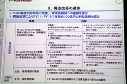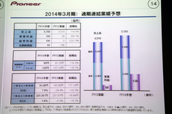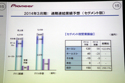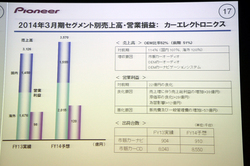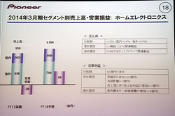 光ディスクドライブ関連製品や市販カーナビの売上が減少したものの、OEMカーナビや市販カーオーディオの売上が増加。カーエレクトロニクスの売上は前期比15.4%増の約3,125億円となった。円安の影響もあり、前年度よりも売上高を伸ばした。一方でホームエレクトロニクスの売上は前期比22%減の959億円。DJ機器は増加したものの、光ディスクドライブ関連製品が、AV機器向けを中心に大きく減少したことが大きかった。