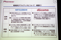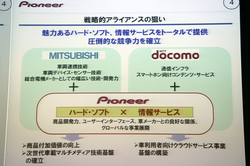 パイオニアとNTTドコモは、クラウド情報サービス基盤の取り組みを強化。NTドコモのスマホユーザー基盤や通信インフラ、コンテンツやサービスと、パイオニアの持つ膨大な交通データや、それらを処理するサーバー技術を組み合わせ、自動車ユーザーへのクラウド情報サービス関連事業を早期に立ち上げる。