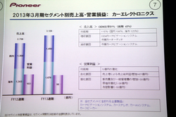 2013年度の通期連結業績予想も発表。売上高は5,150億円、営業利益は150億円、純利益は60億円と予想し、増収増益となる計画だ。カーエレクトロニクスでOEM、市販市場向けともに増収を見込んでいるほか、ホームエレクトロニクスでも、光ディスクドライブ関連製品は引きつづき減収を見込むものの、DJ機器やCATV機器などで売上増を予想している。
