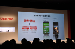 夏モデルの「ツートップ」として紹介された端末はサムスンの「GALAXY S4」と、ソニーモバイルの「Xperia A(エース)」。2機種については利用料金から最大2万円の端末料金割引が適用される特別価格が提供される。