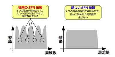 現行の地デジでは、周波数を有効利用するため、複数の送信局で同じチャンネルを使用するSFN技術が使われている。だが、これらの電波を同時に受信すると、互いに弱め合う周波数が生じ、受信品質が劣化するという課題があった。
