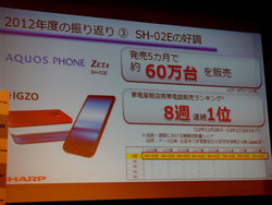 IGZO搭載モデルの出荷割合が当初計画の30%を上回る40%強となったこと、ドコモ向けの「AQUOS PHONE ZETA SH-02E」が発売5ヶ月で約60万台出荷、家電量販店ランキングで8週連続1位を獲得したことなどを紹介し、「予想以上に皆様に評価いただいている」と語る。