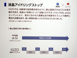 その上で「IGZOは次のステージに進む」と宣言。2013年度上期モデルではスマートフォン最高解像度の460ppiを実現したこと、車のアイドリングストップのような動きでバッテリーを長持ちさせる仕組みについても新たに省電力制御エンジンを開発して精度を向上させたことなど、従来よりも進化を遂げていると紹介する。
