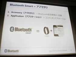 こういった状況をふまえ、Bluetoothは「あらゆる機器が接続可能になる先」として、「相互接続性」「アプリケーション」「ウェブサービス」の3つの向上をビジョンとして掲げていくとした。さらに、低消費電力と各種アプリケーションに対応したBluetooth Smart機器の普及を進めていくことを強調。また、Bluetooth Smart機器をAccessory(アクセサリー)とApplication(アプリケーション)を兼ね備えたデバイスとして「アプセサリ」と名付け、普及を推進していくという。