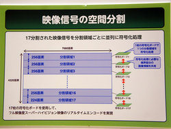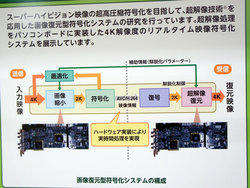 SHV映像の圧縮・伝送については、三菱電機と共同開発したHEVC(H.265)エンコード装置(関連ニュース)を展示し、85Mbpsで、SHV映像をHEVCでリアルタイムエンコードした。また「超解像技術を用いたリアルタイム映像符号化システム」と題したデモも披露した。4K映像を2Kに縮小してから縮小してから圧縮符号化することにより、4K解像度の画像を直接圧縮するより圧縮率を緩和し、これによりブロック状の歪みを抑える。そして復号後に超解像処理を行い精細感のある高解像度映像を復元するというものだ。