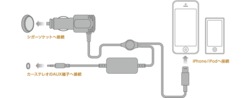 本製品はカーステレオのAUX端子に接続してiPhoneやiPodの再生が楽しめるチャージャー付きオーディオケーブル。シガーソケットからの給電により、iPhoneやiPodなどを充電しながら音楽再生を行うことができる。また、iPhoneやiPodの再生は、エンジンの停止に連動して音楽再生が一時停止される。