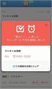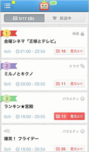 TimeOnの録画予約データを活用し、これから放送される注目テレビ番組をレコメンドするアプリ。毎日届けられるランキングをチェックし、「見たい!」ボタンを押すとiPhoneの純正カレンダーに放送予定が登録される。番組開始前に通知を受け取ることが可能。GREEやFacebook、Twitterなどで、自分が観たい番組をシェアすることができる。