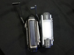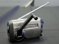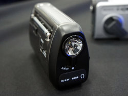 乾電池駆動に加えて、ハンドルを回しての駆動が可能。従来機「ICF-B03」(関連ニュース)よりもハンドルを長くしグリップも大型化、ジョイント機構の強度もアップさせたことで手回しを行いやすくし、発電効率を向上させている。従来は1分間の充電(ハンドル手回し)でAMラジオ約60分聴取が可能だったところ、今回は1分間充電で約75分間の聴取が可能。
