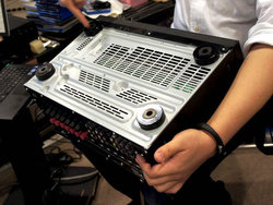 さらに、シャーシも新規設計。絞りビームの横幅やレイアウトを変え、不要振動や共振の低減を図っている。また、「結構熱の出るパワーアンプを実装しているため、放熱穴の開け方も工夫している」とのことで、互い違いにしたり大きさを少しずつ変えるなどで共振しないように配慮しているという。