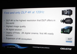 同社の高速画像処理技術「Christie TrueLife」を用いて、世界で初めて4K/120Hz表示に対応。これにより動きの速い動画を滑らかに表示することが可能となった。またアクティブ方式の3D投映も行え、各種3Dフォーマットに対応している。