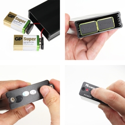 電源に9V電池2本を使用。約9時間の連続駆動が可能だ。ヘッドホン出力、プレーヤー入力(ともに3.5mmステレオミニ)を用意している。