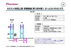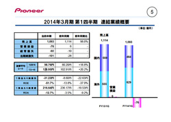 大幅な円安の効果があったものの、市販カーナビや光ディスクドライブ関連製品が減少したことにより、売上高は前年同期比で減収。営業損益も、利益率の高い市販カーナビの減収等による原価率悪化、為替の影響などにより、前年の黒字から赤字へと転じた。また当期純利益も、主に営業損益の悪化により赤字となった。