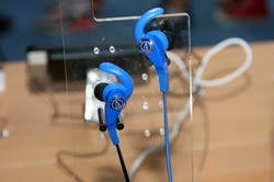 中位モデルの「ATH-CKX7」は硬度の異なる2種の素材を重ねた新ダイヤフラムを採用した8mmドライバーを搭載。耳穴の角度に合わせてハウジングが可動する新設計のボールジョイント構造を採用し、Cチップと合わせて更なる装着感が図られている。展示されていたブルーのモデルは鮮やかでポップなカラーが印象的。街で身につけていると目を惹きそうだ。