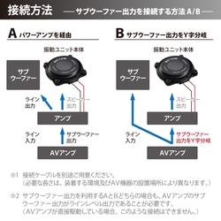 出力は20W。振動ユニット本体を、台座や床、シートなどに取り付けることで、低音の臨場感を振動で補うことができる。接続は、AVアンプのサブウーファー出力をパワーアンプを介してユニット本体へライン接続するなどの方法がある。