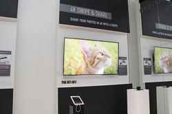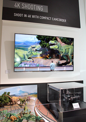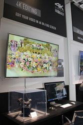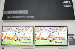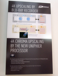 4K 50p/60p信号入力に対応。Dispay Port 1.2aを備えるほか、新規格・HDMI 2.0対応端子を搭載し、色信号を圧縮しない4:4:4入力にも対応している。現状ネイティブの4:4:4信号を出力できるBDレコーダー/プレーヤーは存在しておらず、今後の登場が予想される。会場では、3週間前に発売されたばかりだという新BDレコーダー「DMR-BST835」(DMR-BZT9300の欧州モデル。クロマアップサンプリング処理により4:2:0→4:4:4に変換出力できるのが特徴)と組み合わせてのデモが行われていた。
