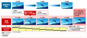 4K画質を向上させるための画質機能も搭載。「4Kフレームクリエーション」は1秒60コマで構成される動画を解析し、動きを予測して新しいコマを補間する機能。LEDバックライトの分割駆動を用いて、映像に合わせて分割したブロックのバックライトを順次オフにして黒を挿入した発光を行うことで、残像感も大幅に低減したとのこと。16倍速相当の映像表示が可能となるという。