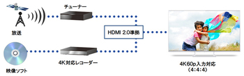 本機は9月4日に発表されたHDMIの最新規格である「HDMI2.0」(関連ニュース)に準拠し、4K/60p映像信号の入力に対応する。また、色信号を圧縮しない「4:4:4」入力も可能となり、「シネマプロモード」においては同社のBDレコーダーで「クロマアップコンバート」した4:4:4映像信号をより豊かな色合いで表示できる。