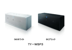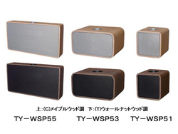 内蔵リチウム充電池を電源とするポータブルBluetoothスピーカーで、各モデルともにmicroUSB端子から充電を行う。「TY-WSP51」「TY-WSP53」「TY-WSP55」の3機種は木目調仕上げのキャビネットに高密度MDF材を使用し、ウォールナット調/メープル調の2つの外装を用意。「TY-WSP3」はブラック/ホワイトの2色を用意する。