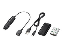 シガーソケットからアクションカム本体への給電が可能。また、予備バッテリーのNP-BX1と同バッテリーのチャージャーもセットになっており、車での移動中に予備バッテリーを充電しておくといった使い方もできる。