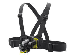 胸の位置にアクションカムを装着して体の中心からの映像を撮影できるというアクセサリー。チルト/水平可変対応のため、サーフィンやスノーボードなど横を向いた状態でも進行方向の映像を撮影できる。