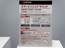 京セラは、前述のように世界最薄のピエゾフィルムスピーカー「スマートソニックサウンド」関連のデモスペースなどを展開。同技術を採用したスマートフォン各モデルの紹介に加えて、触れたものをスピーカーにして音を出す振動スピーカーも参考出展している。