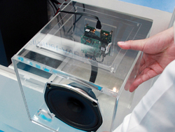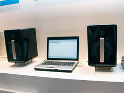 今回参考出展されているPC用のフルデジタルスピーカーは、音声入力にUSB端子を装備しており、最大96kHz/24bitまでの入力に対応する点がポイント。ユニット構成は、トゥイーター×1/ミッドレンジ×1と本体底面にパッシブラジエーターを搭載する。同社では、PCとの直接接続のみで高音質再生が行えるPC用スピーカーとしてアピールする。2014年中の製品化を目指しているとのことで、価格は未定だが「20〜30万円台より下の、ユーザーにとって手の届きやすい価格帯を想定している」(同社説明員)とのことだ。