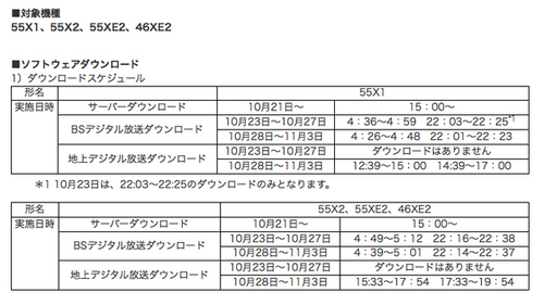 不具合が発生する対象機種は55X1、55X2、55XE2、46XE2。10月1日より、対象機種の一部でBS・110度CSデジタル放送に関する一部情報の取得後の処理に不具合が発生し、映像が映らなくなる症状が報告されていた。対策ソフトウェアのダウンロードスケジュールは以下の通り。詳細はこちら。