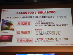 LGエレクトロニクス・ジャパン(株)は、65型/55型の4K対応液晶テレビ“LA9700”シリーズを11月上旬に発売する。価格はいずれもオープンだが、65型「65LA9700」は65万円前後、55型「55LA9700」は45万円前後での実売が予想される。
