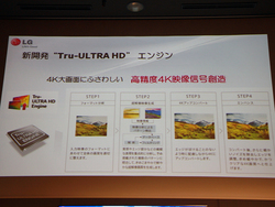 解像度3,840×2,160の4K表示に対応する液晶テレビで、今年6月に韓国で発売開始したモデルの日本投入が明らかとなった格好だ。同社が日本国内で4K対応テレビを発売するのはこれが初めて。新開発の4K対応IPS液晶パネルを採用し、4Kアップスケーリング機能を備える「Tru-ULTRA HDエンジン」を搭載する。さらに次世代動画圧縮形式「HEVC」に対応するデコーダーも搭載している。