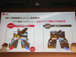 本機はパッシブ方式の3D表示にも対応。同社独自の3D方式であるFPR方式を採用しており、フレームレートは240Hz相当。3D映像表示時にも、パネルを4倍速相当で表示する。