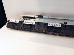 ユニット構成は、フルレンジ×2/ソフトドームトゥイーター×2/ミッドレンジ×2/ウーファー×1をマウントする3ウェイ7スピーカーで、出力は合計50W。ウーファーはテレビ背面に装備している。