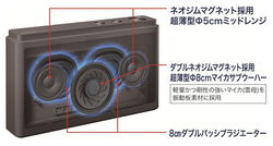 NA30は5cmのミッドレンジ2基、8cmマイカサブウーファー1基の2.1chスピーカーを搭載。ユニットにはいずれもネオジウムマグネットを採用している。加えて、8cmのパッシブラジエーターもダブルで搭載した。小型、薄型ながら低音の再現能力を高めることをねらった。
