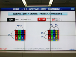 XL10シリーズの大きな特徴は、新技術「超解像 分割駆動エンジン」を搭載することにより、フルHDパネルで4K相当の高精細表示を実現した点。シャープによれば、「画面の高精細感は輝度ピークの数で決まる」ということに着目して開発された技術だという。