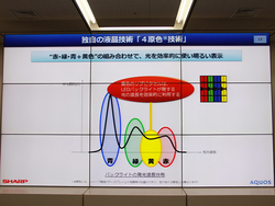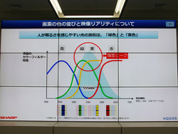 緑と黄色は、人間が明るさを感じやすい=比視感度が高い色とされる。一般的な赤・緑・青色のサブピクセルで構成される画素は、比視感度が高い緑が輝度ピークとなるが、同社の4原色技術では、赤・緑・青・黄色のサブピクセルの中で比視感度が高い緑色と黄色が輝度ピークとなり、1画素内に2つの輝度ピークを確保した構成としている。