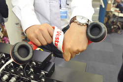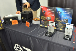 ベスタクスブースは密閉型オーバーヘッドホン「HMX-05」の新色ホワイトをフィーチャー。φ40mmのドライバーを搭載しており、再生周波数帯域は20〜20,000Hzで、音圧レベルは103dB/mW、インピーダンスは22Ω、最大入力は100mW。プラグは3.5mmステレオミニプラグで、6.3mm標準プラグの変換アダプターも付属する。ヘッドバンドが非常に柔軟なのも特徴だ。