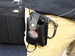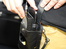 同社では、AK10とiPhoneを接続したまま収納できるポーチも参考出展。外側が円形に開口していて、ポーチに収納したままAK10のボリューム調整が可能だ。