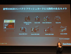 新製品である256GBのサンディスク エクストリームプロ コンパクトフラッシュカードは、世界最速という160MB/秒の最大読み取り転送速度を実現。最低持続書き込み速度となるVPG(Video Performance Guarantee)は65MB/秒で、シネマレベルの4K動画やフルHD動画の撮影に最適化しているという。