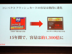 そしてサンディスク(株)代表取締役マネージング・ディレクターの青柳マテウ氏は「弊社が初めて日本でメモリーカードを発売した1998年と現在のラインナップを比べると、この15年で容量は1,300倍になった」と、製品の進化について言及。「スピードも2001年の最大2.8MBから12年で約35.7倍になった」と、大容量化と高速化がめざましい速度で進んでいることを紹介する。