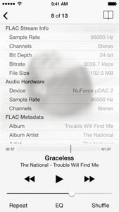 アルバムアートをタップすることで、FLACファイルのサンプリングレートやビット深度、ビットレートなどの基本情報の他、メタデータも参照可能。